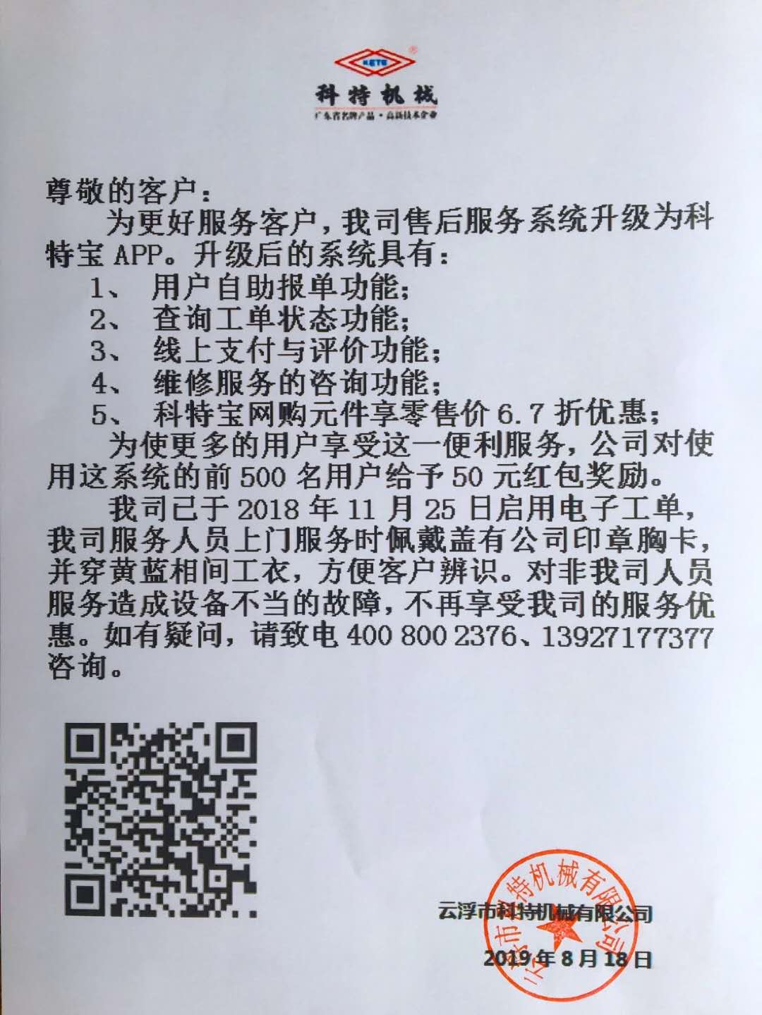 為更好的服務(wù)廣大客戶,實(shí)現(xiàn)更高效、更快速、更專業(yè)的售后服務(wù),科特機(jī)械擁抱互聯(lián)網(wǎng)資訊時(shí)代,將我司售后服務(wù)系統(tǒng)升級(jí)為科特寶A......